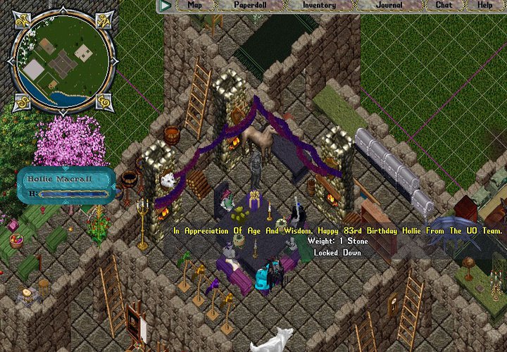 На скриншоте она отмечает день рождения в кругу своей виртуальной семьи. UO Team в честь этого события подарили ей букет цветов с гравировкой ‘In Appreciate of Age and Wisdom, Happy 83rd Birthday Hollie from the UO Team’.