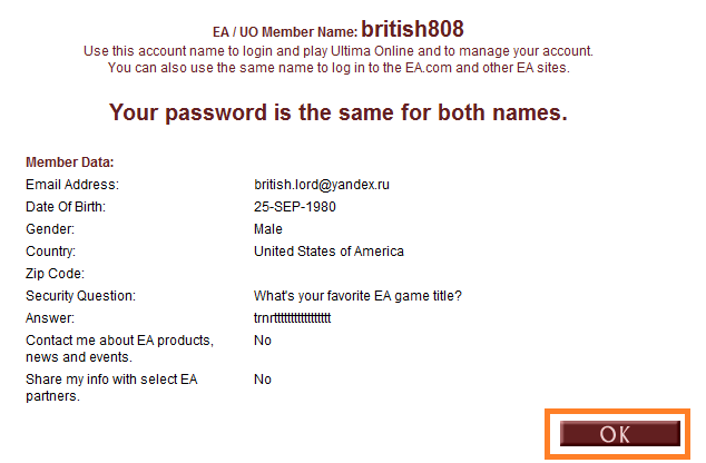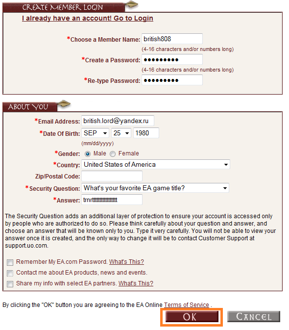 3. Вводим желаемый логин, пароль, повторяем ввод пароля, вводим почту, дату рождения, пол, страну, почтовый индекс (необязательно), секретный вопрос и ответ на него. Убираем галку ‘Contact me about EA products, news and events‘. Нажимаем ОК.